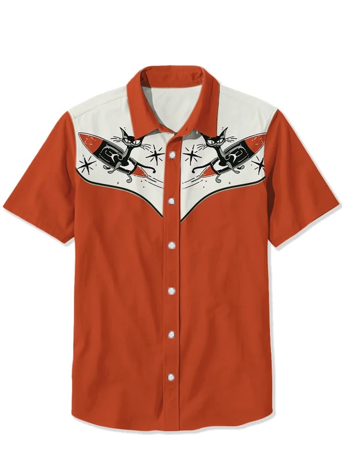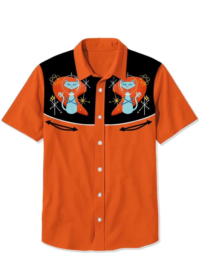 Men's Western 1950s Atomic Rocket Cat Print Casual Shirt
