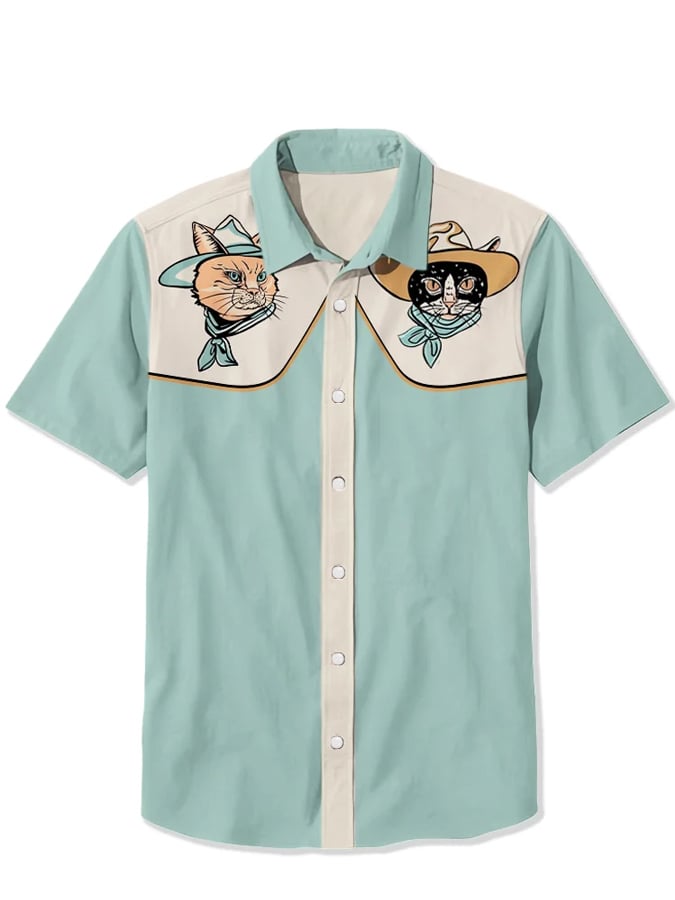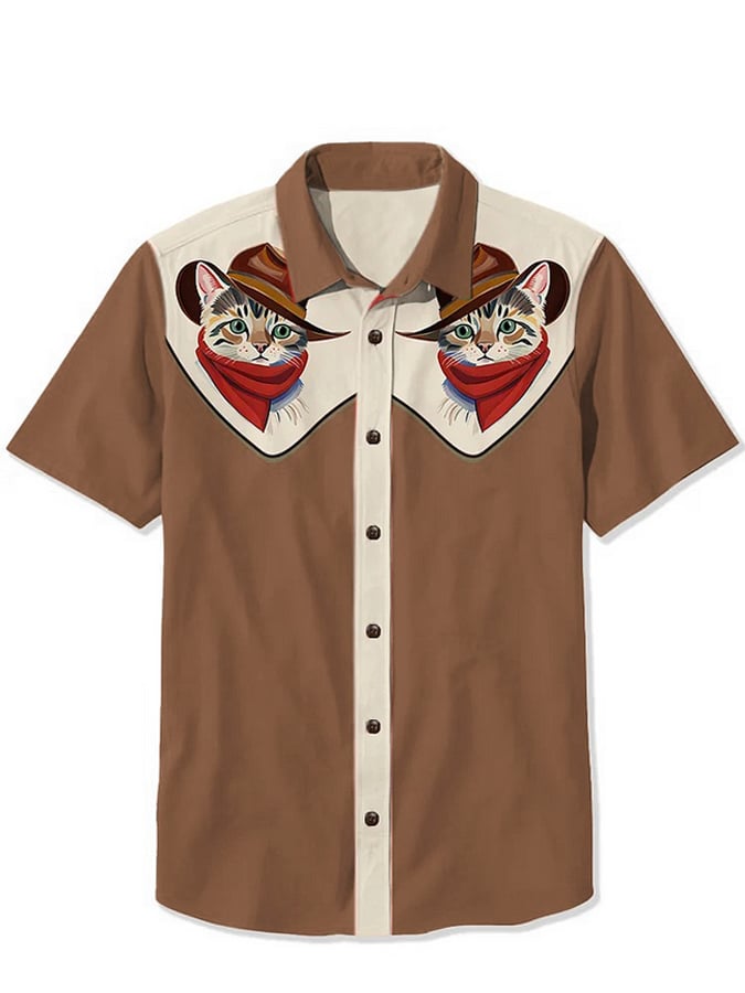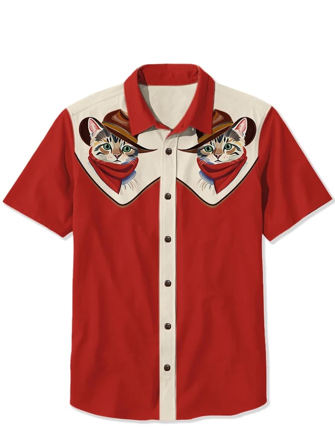 Men's Western 1950s Interstellar Space Cat Print Casual Shirt