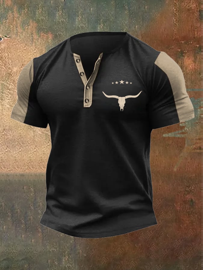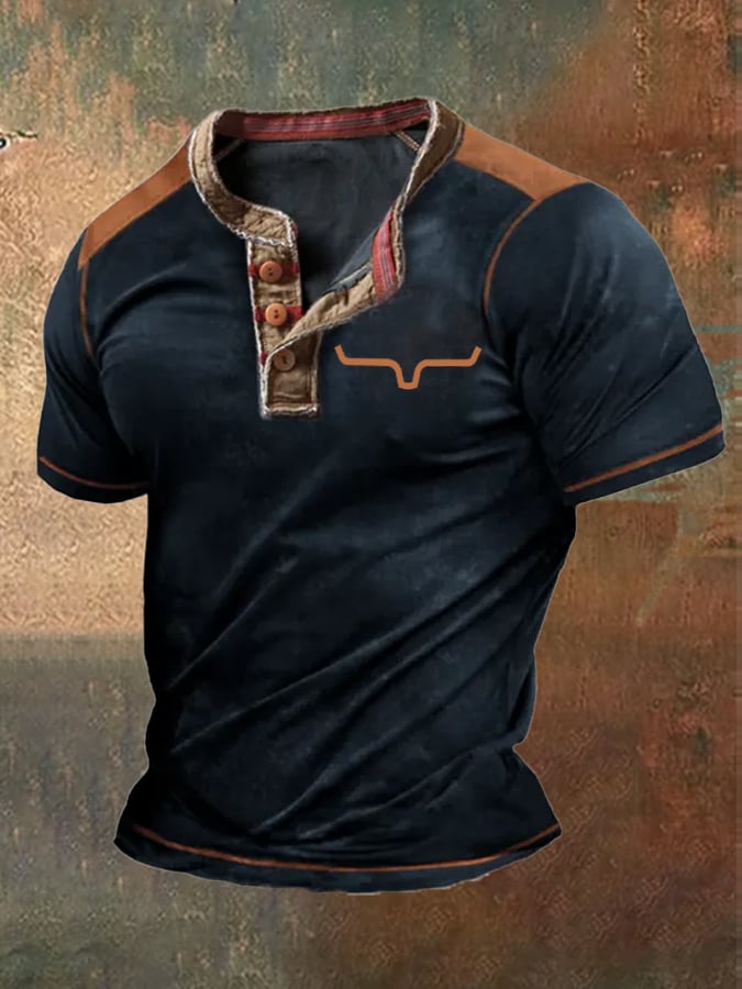 Men's Vintage Western Print Henley Neck T-Shirt