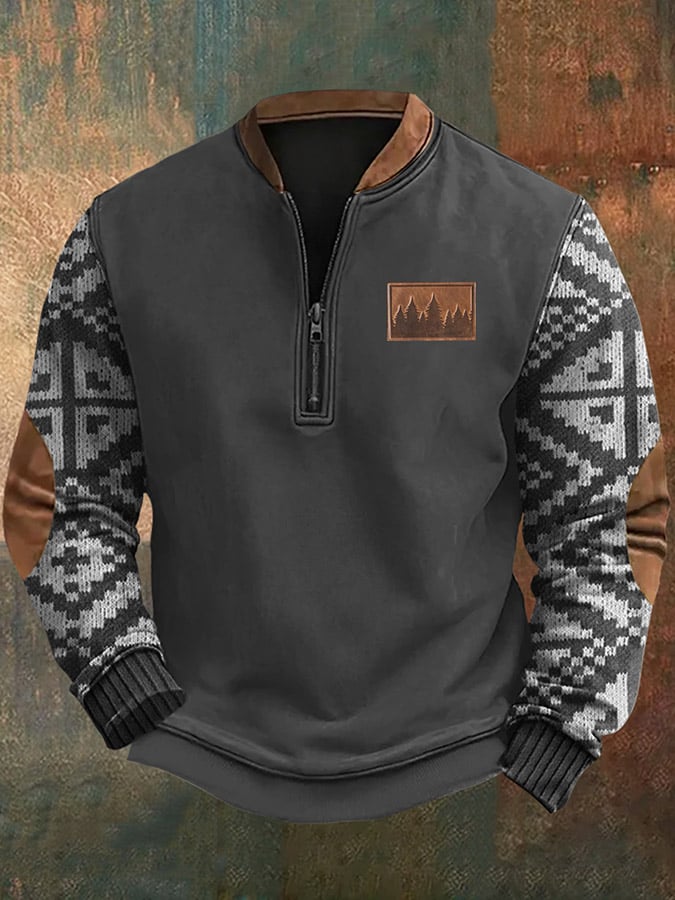 Men's Vintage Western Knit Print Zip-Neck Sweatshirt