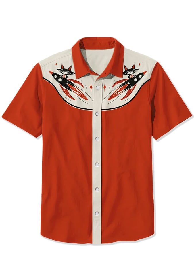 Men's Western 1950s Atomic Rocket Cat Print Casual Shirt