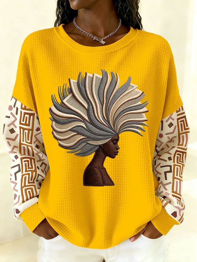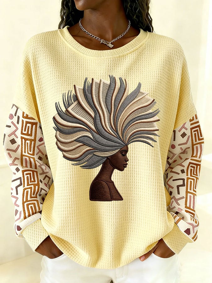 Women's Black Girl Art Print Knitted Round Neck Long Sleeve Top